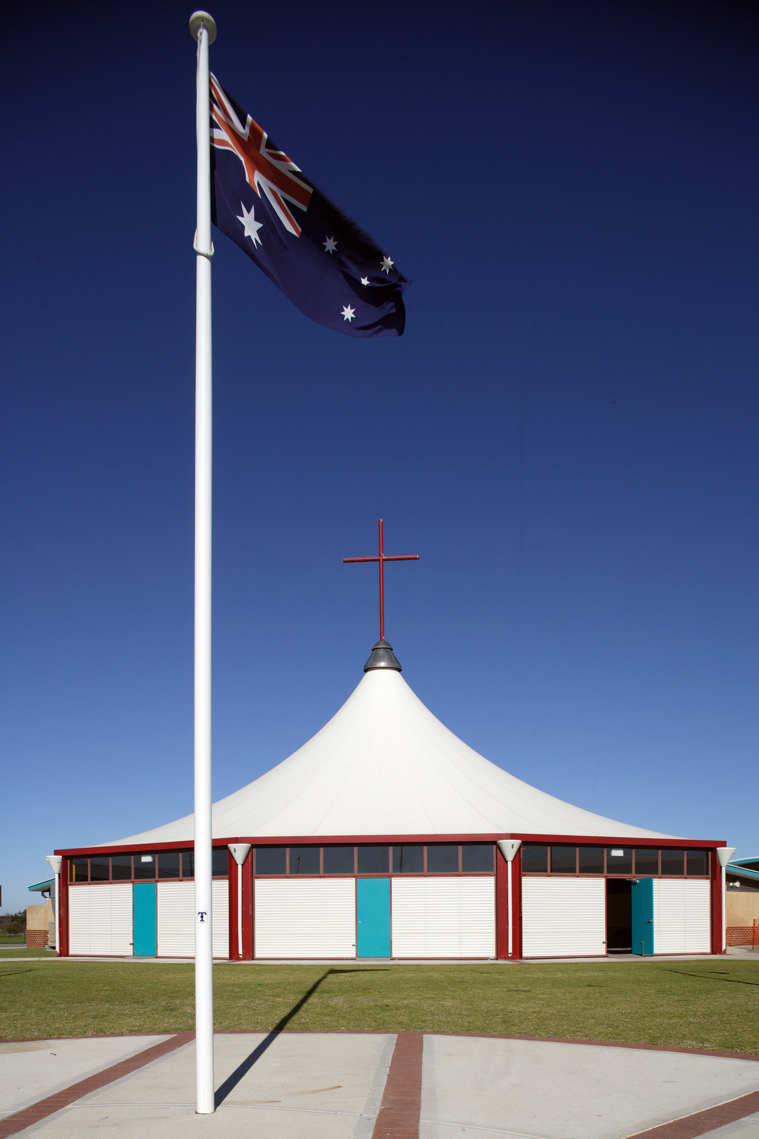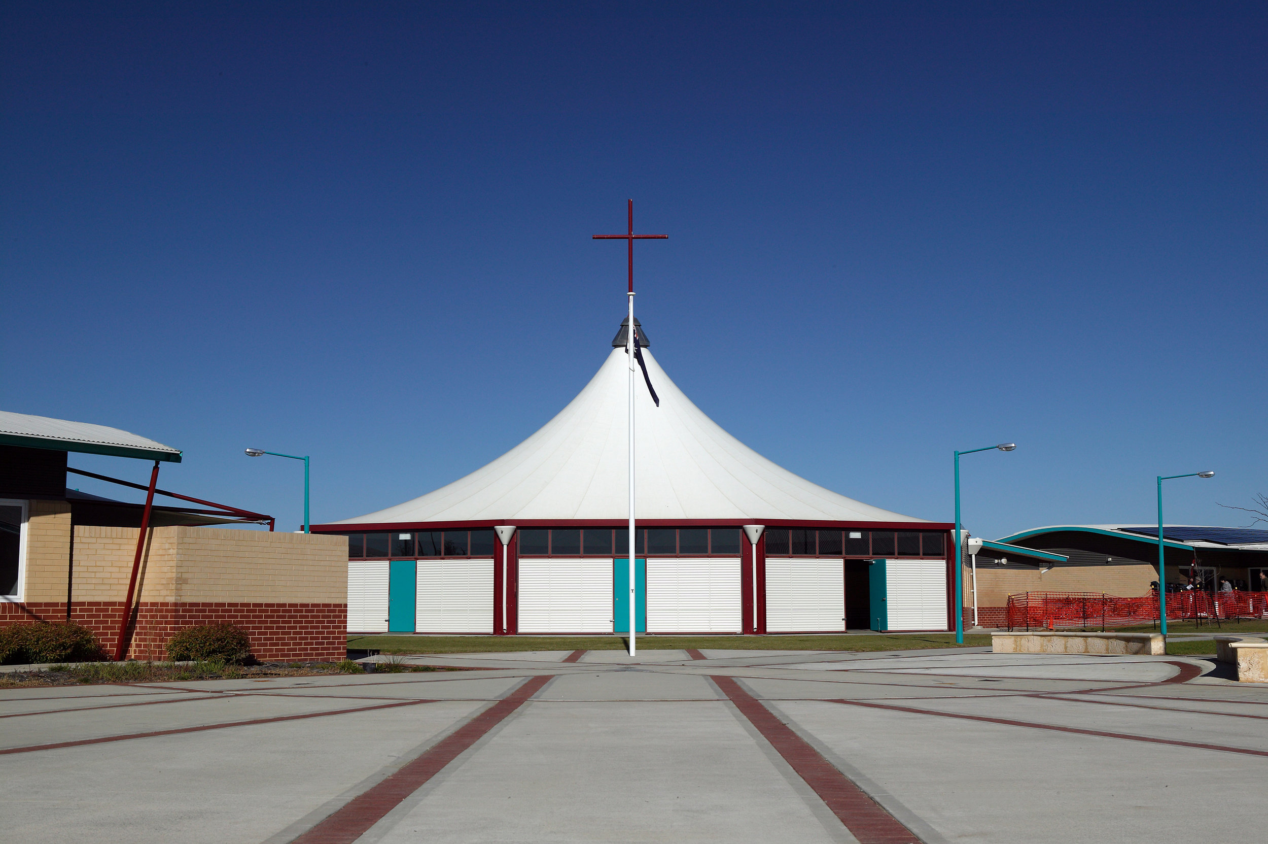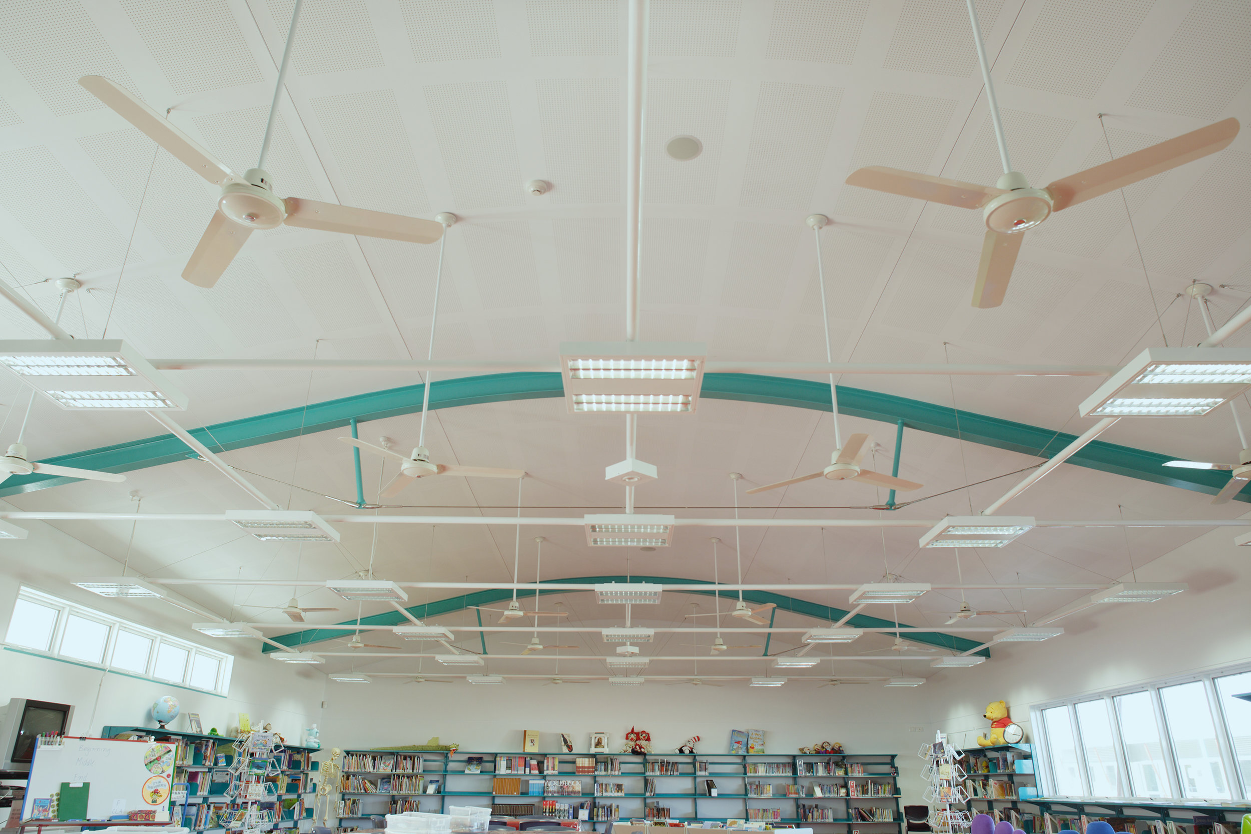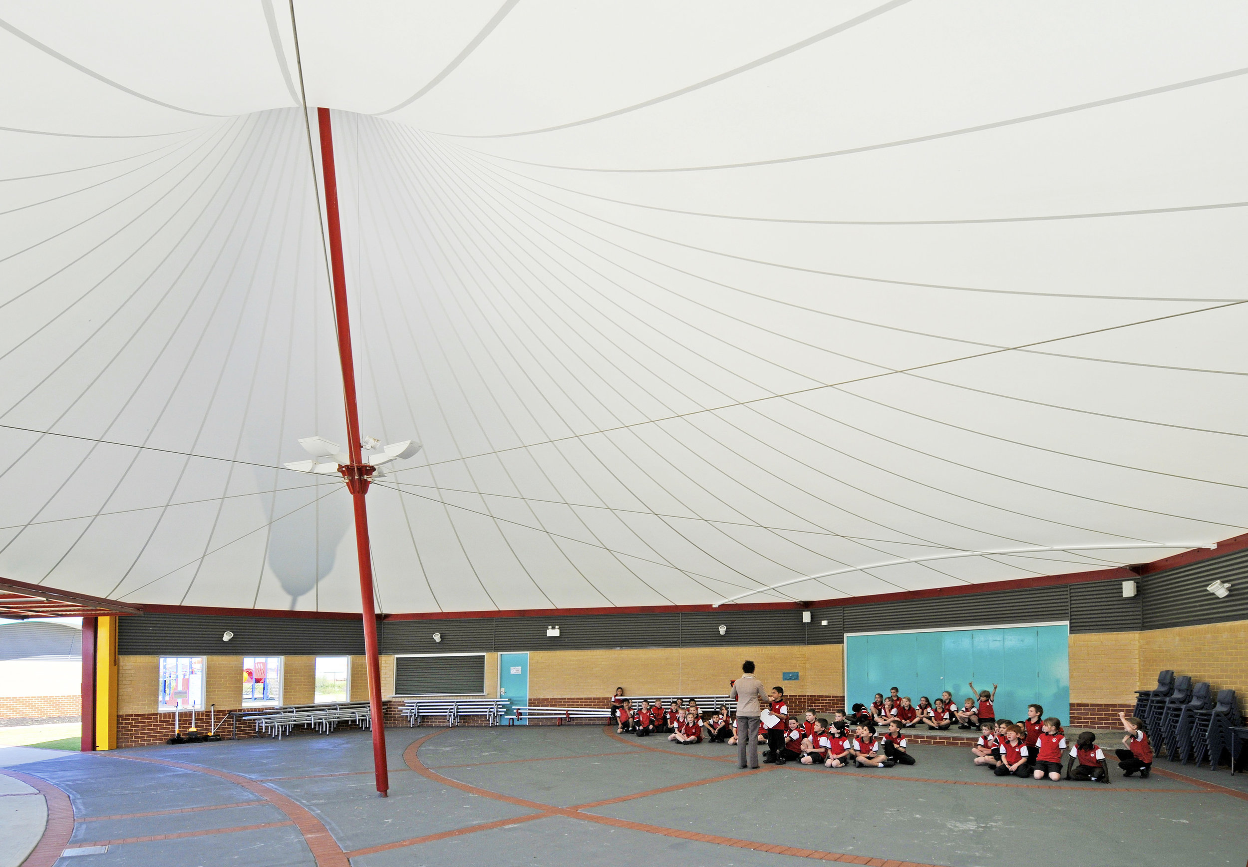 The School is set around two highly legible internal intersecting streets which double as service corridors. The draped roof forms are gently curved in the manner of the dunes, while the single span without penetrations reduces maintenance and maximises the flexibility of the space below them.