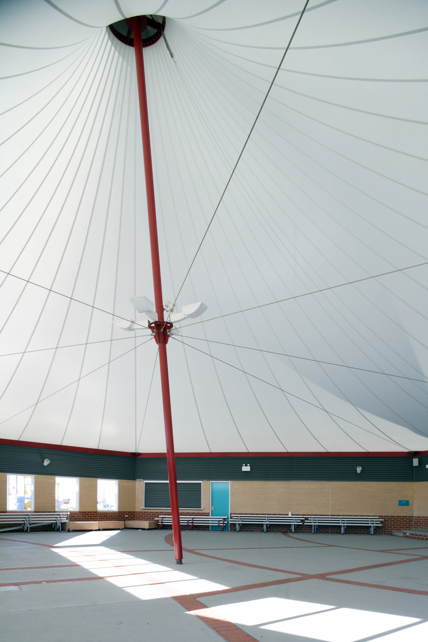 A cone membrane structure supported on a bicycle wheel-like frame, staying cool in summer due to lamina air flow across its lower surface. The translucence of the material results in adequate daytime lighting without artificial supplementation.