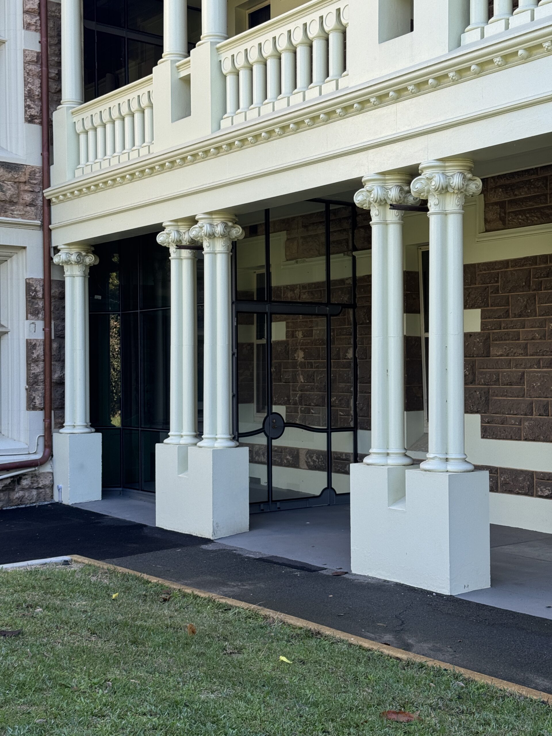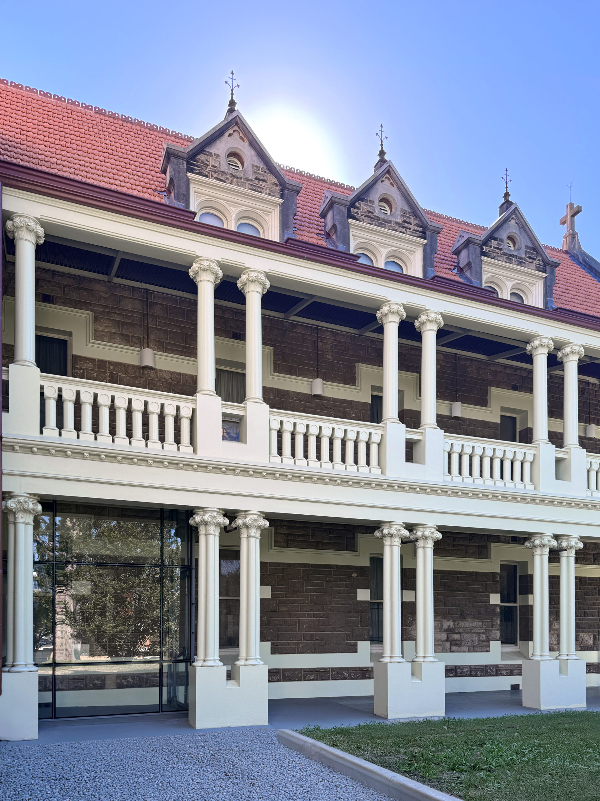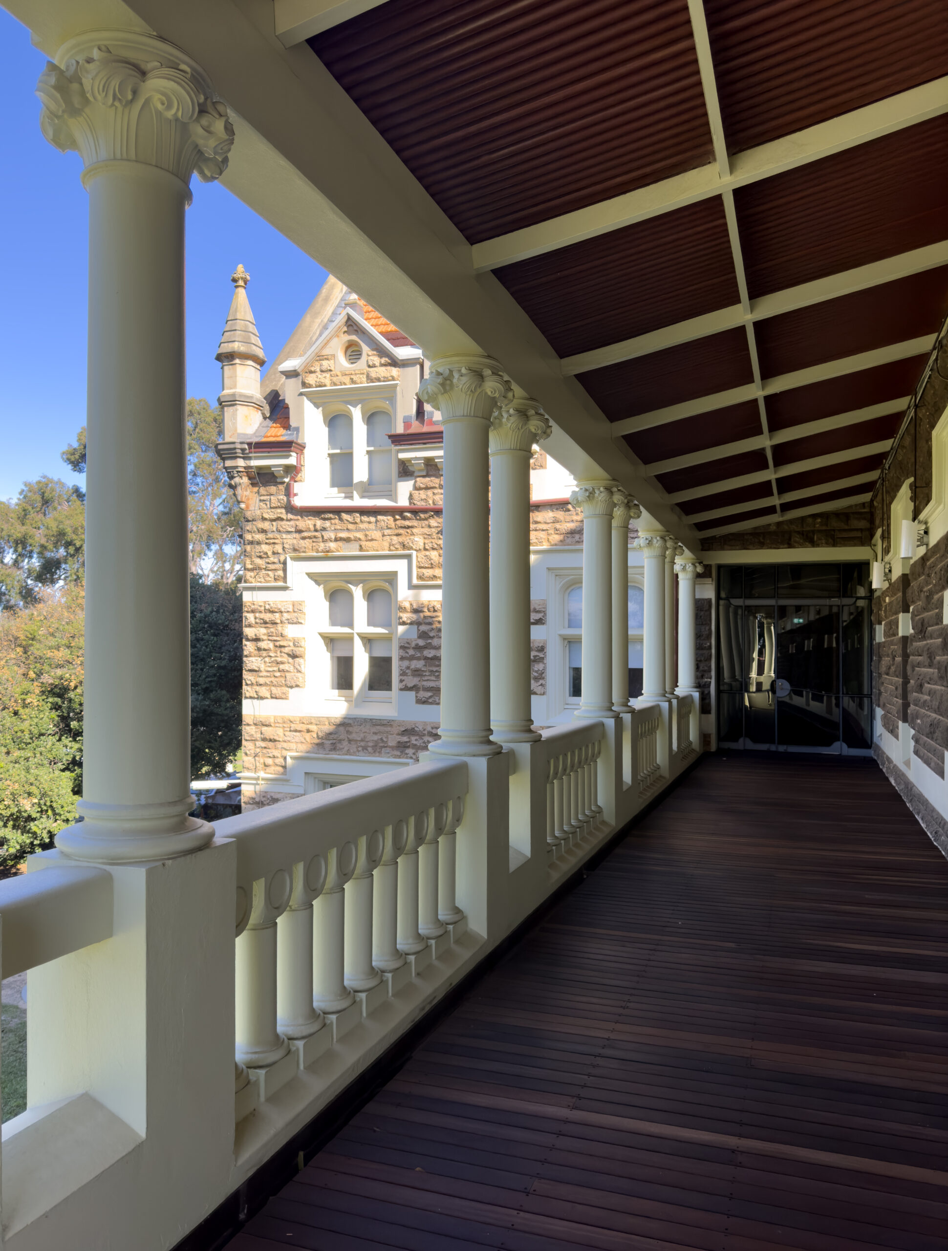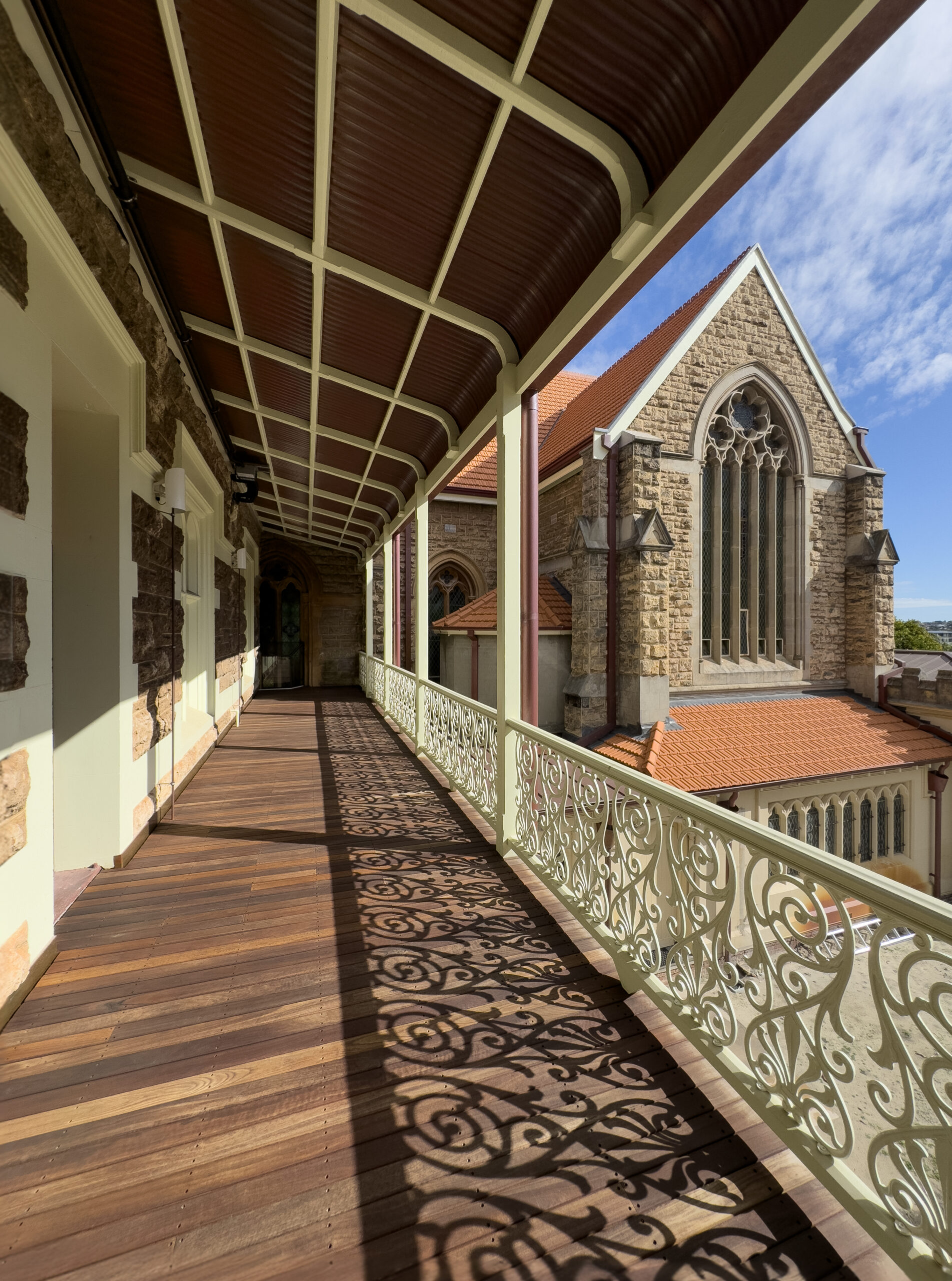 The monastery’s two-storey verandahs on the north and south sides had withstood more than a century of weathering, but time had taken its toll and most of the original timbers required replacement. The pressed metal verandah soffits, once a decorative highlight, had also corroded badly as water penetrated through the floors. To safeguard the new work and prevent future damage, an innovative self-draining subfloor system was introduced – a discreet yet vital improvement designed to manage water effectively and protect both structure and finishes.