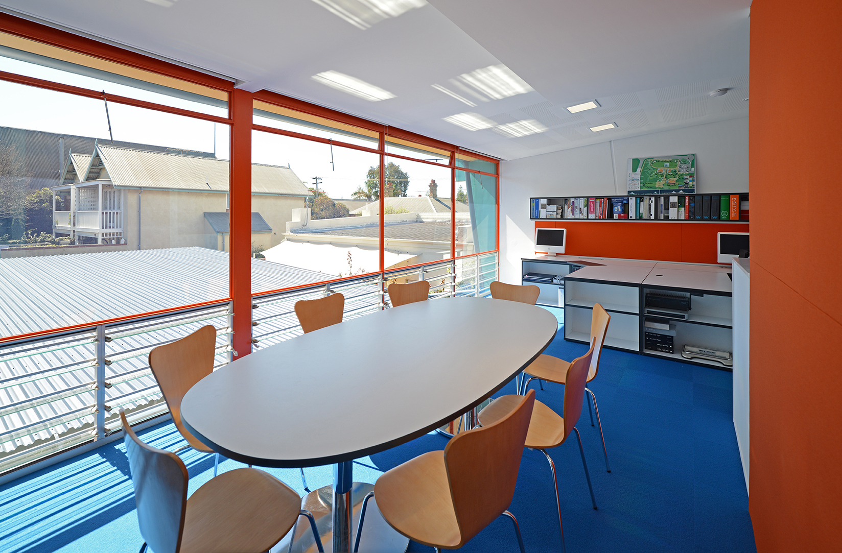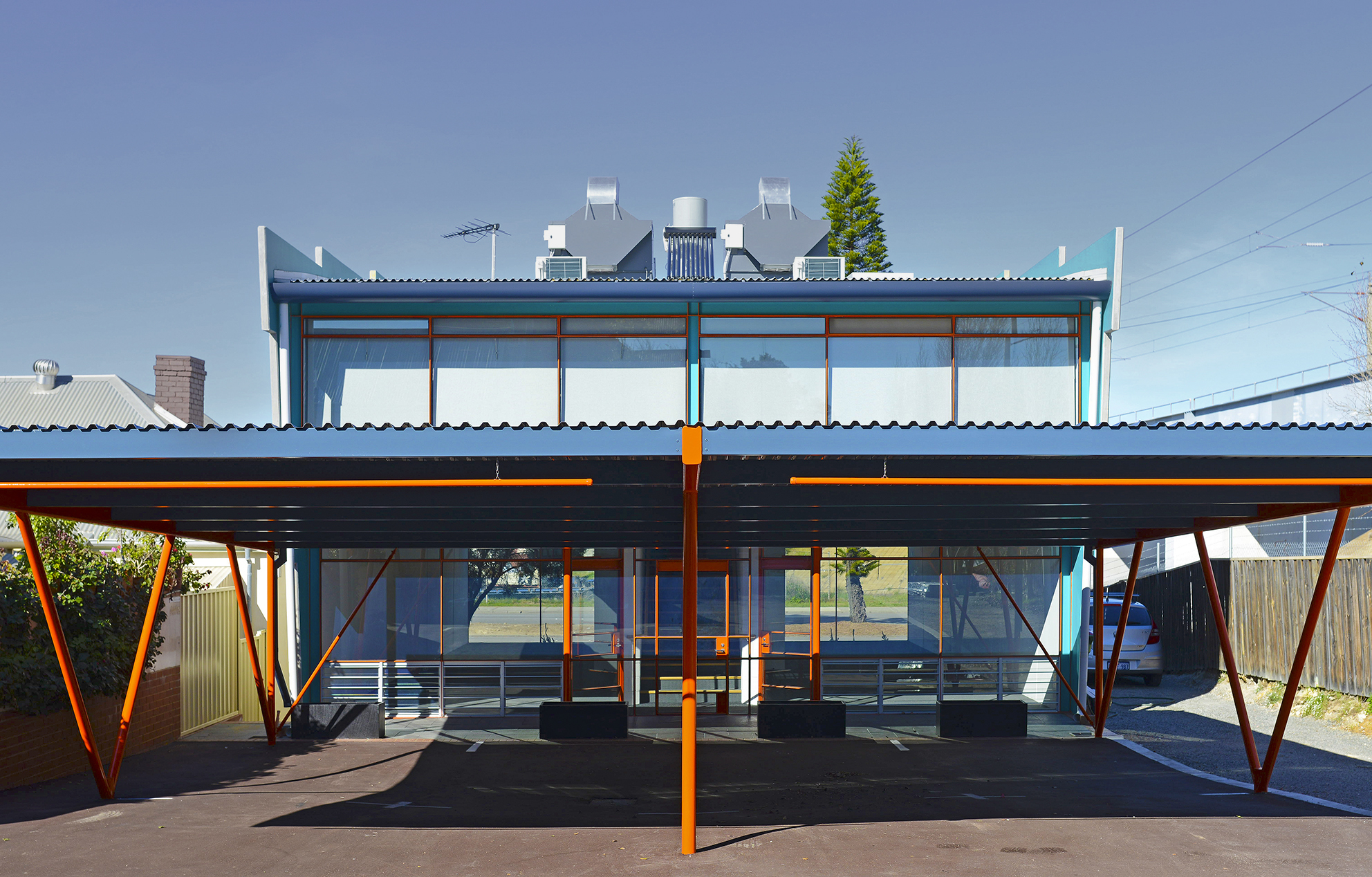 Built on an undesired remnant site beside the train line, the building makes productive use of land unsuitable for residential development. Constructed from insulated concrete panels, it achieves excellent thermal performance, supported by operable louvres and a Climate Wizard air conditioning system that uses 80% less power than conventional systems while delivering 100% fresh air. Floor-to-ceiling glazing provides natural light, while low-energy LED fixtures reduce operational consumption. A tank beneath the building captures rainwater, which is used for our toilets and irrigation.